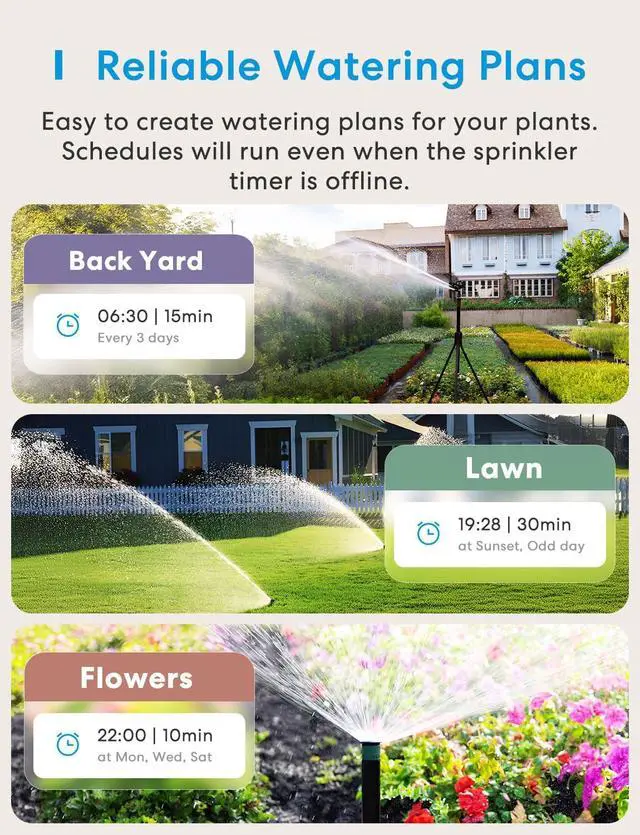 Weather-Based Automatic Skip: Using hyper-local weather data, the WiFi sprinkler timer automatically skips watering before, during, and after rainor in freezing/windy conditions. No more overwatering or flooded yards!