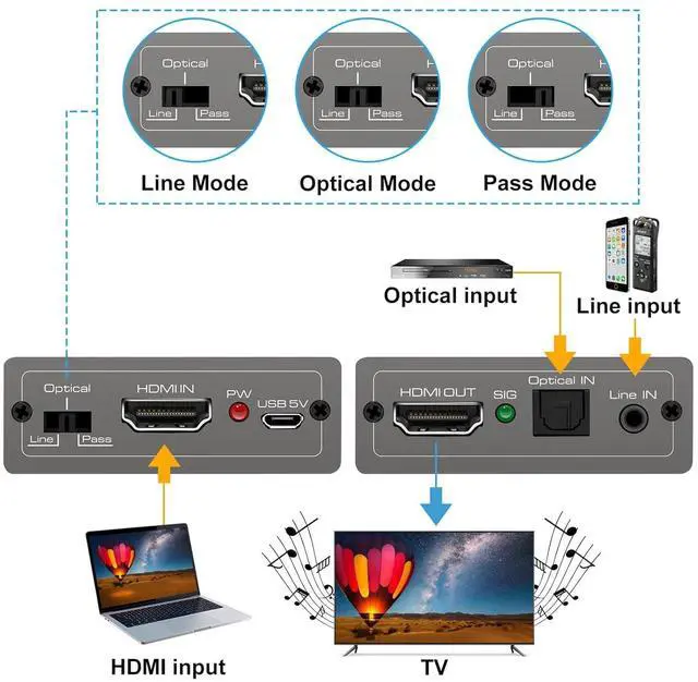 Note: Only the audio output port can be converted, and the audio format cannot be changed. For example, if the 3.5 mm port is a two-channel audio input, the audio output via the HDMI port after conversion will still be two-channel. The audio input channels corresponding to the dipswitch positions are as follows: "Line" means the audio uses the 3.5 mm port, "Optical" means the audio uses the optical port, and "Pass" means the audio uses the straight-through HDMI port.