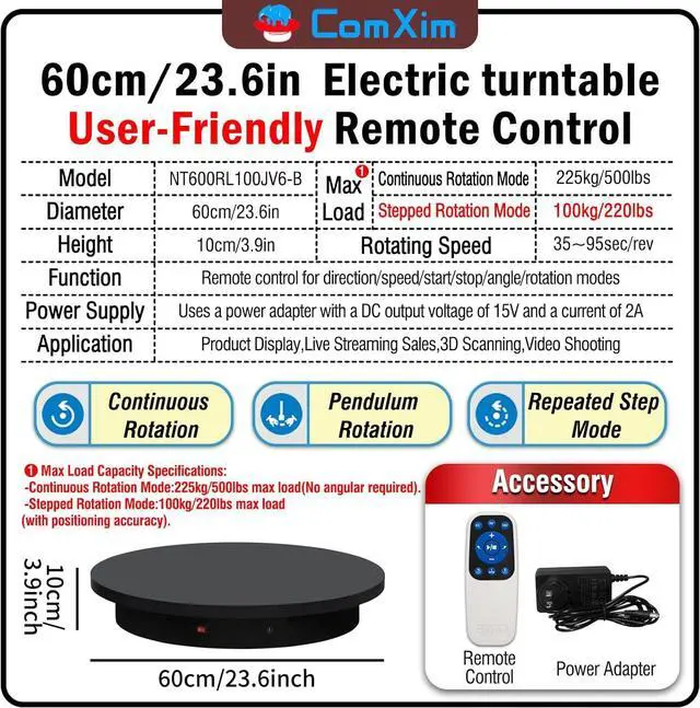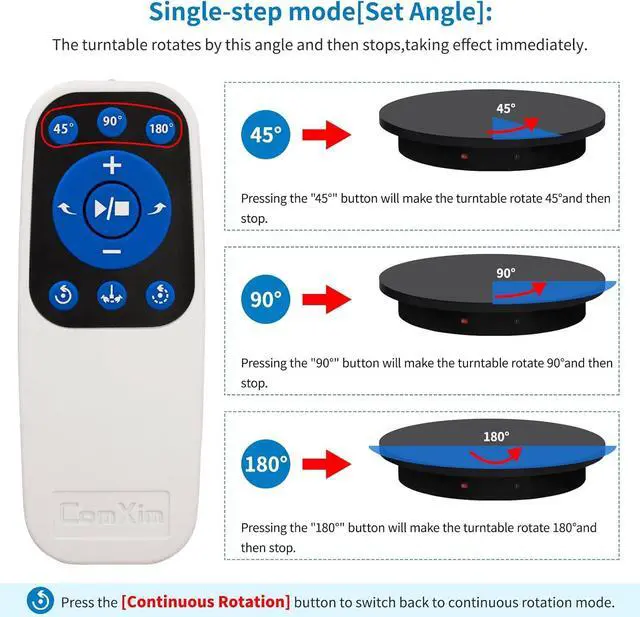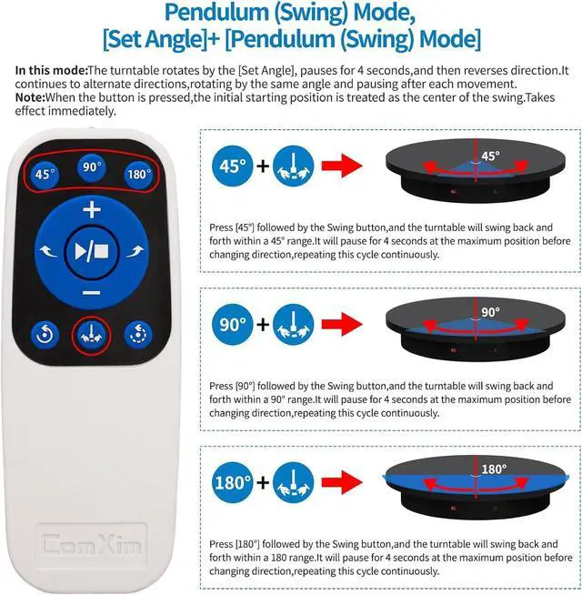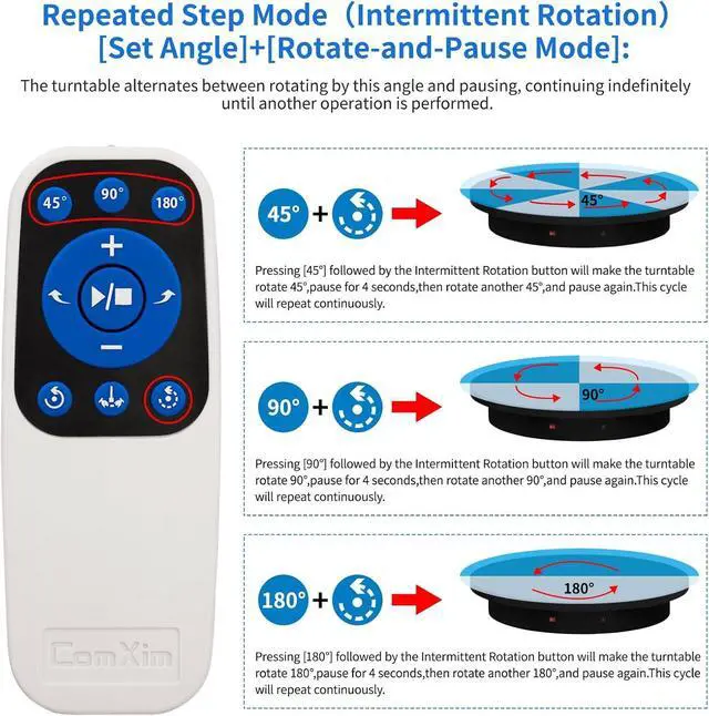 This Photography Turntable Supports remote control of four rotation modes: Continuous rotation. Single-step rotation at 45°, 90°, and 180°. Repeated step rotation at 45°, 90°, and 180°. Pendulum (swing) rotation at 45°, 90°, and 180°. Allows remote control for both clockwise and counterclockwise rotation. This Heavy duty rotating display stand Supports remote control for start/pause and speed adjustment (increase/decrease).