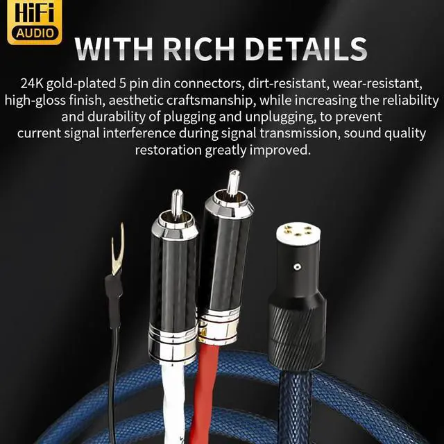 [24K Gold-plated 5 Pin Din Connectors] LC800 Vinyl tonearm cable adopt 24K gold-plated 5 pin din connectors, PTFE Insulation, dirt-resistant, wear-resistant, high-gloss finish, aesthetic craftsmanship, while increasing the reliability and durability of plugging a
