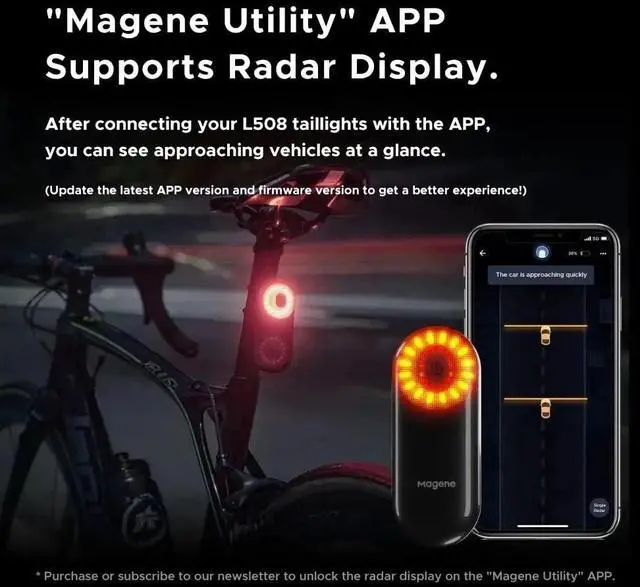 L508 tail light can be connected to below bike computers that can support the standard protocol: C406Pro, Garmin 130, 130P, 520, 520P, 530, 820, 830, 1000, 1030, 1030P, Wahoo Bolt, Roam, Bryton R750, S500, Garmin 245, 645, 735, 745, 935, 945, D2, Fenix 5, 5s, 5x, 5Plus, 5xPlus, 6s, 6x, 6Pro, 6sPro, 6xPro, etc.. Utility APP supports radar display. You can view approaching vehicles at a glance. * Purchase to unlock radar display function or subscribing our newsletter.