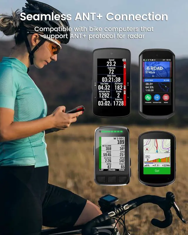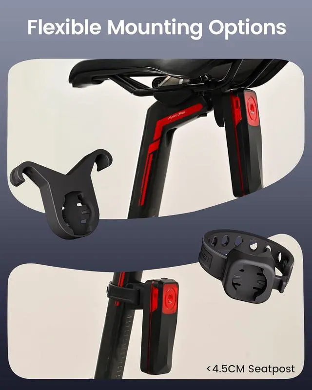 [Adaptable & Weatherproof] Mounts securely to round, and aero seat posts which are no more than 4.5 cm wide; Also fits saddle rail mounting; IPX6 waterproof rating delivers stable performance in rainy conditions (tighten the charging cover before cycling)