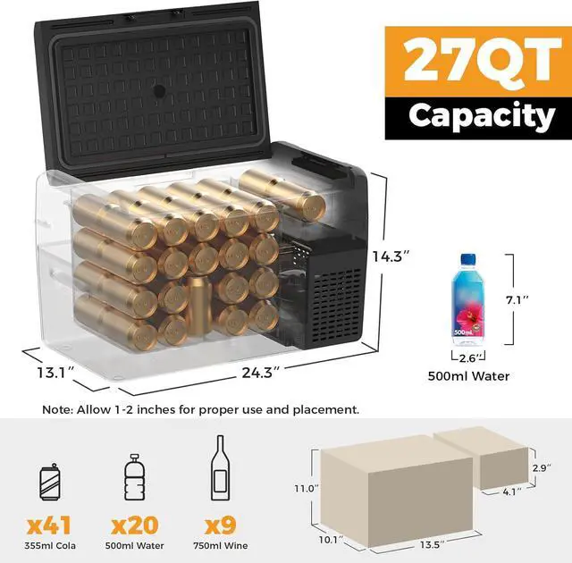 Dimension: 24.3 * 13.1 * 14.3 in, Weight: 23.5 lb. You can run this 12 volt cooler not only 12/24V DC power, but also 120/240 AC