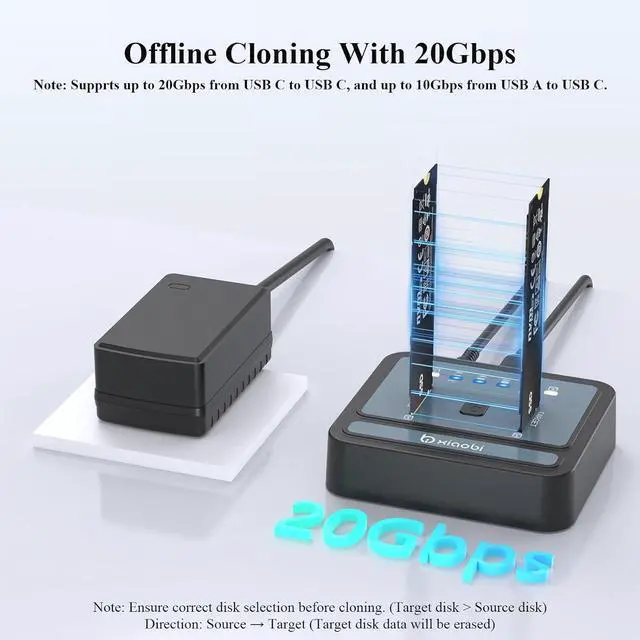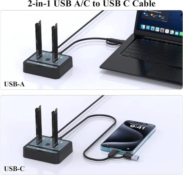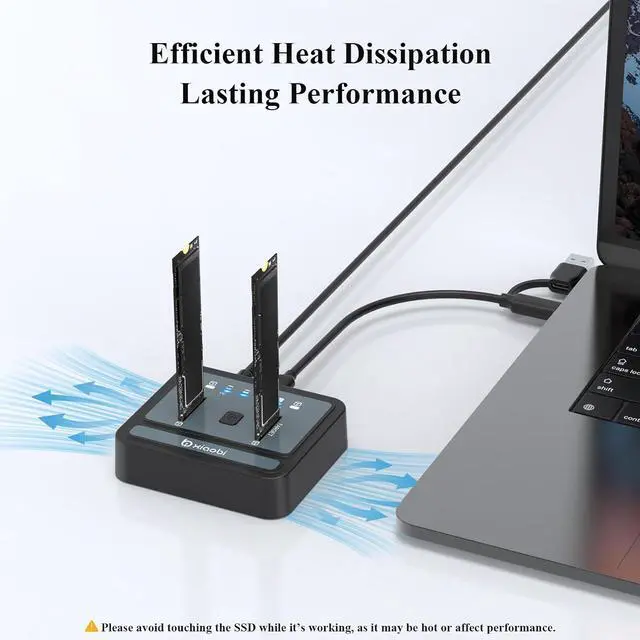 Dual M. 2 Dock Compatible with NVMe & SATAThis dual M. 2 enclosure supports PCIe NVMe SSDs with M-Key or M+B Key and SATA SSDs with M+B Key, compatible with 2230/2242/2260/2280/22110 sizes. One device meets multiple SSD size needs.