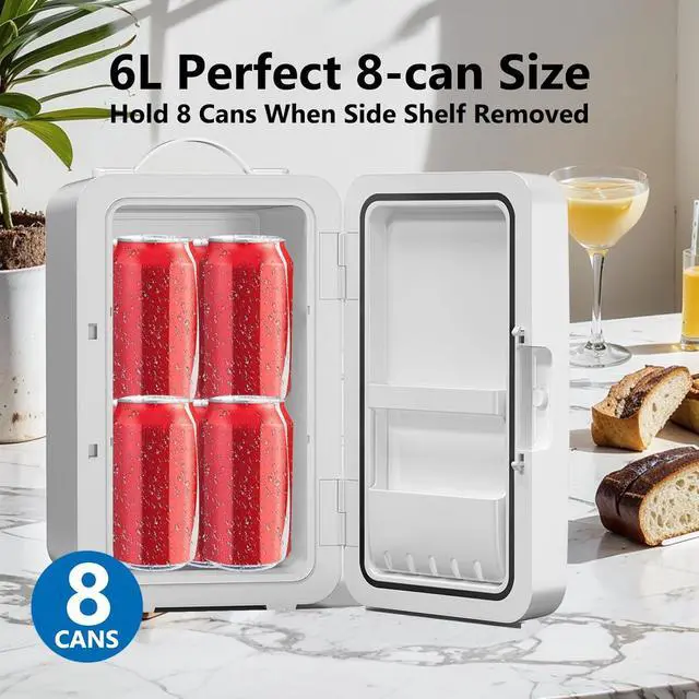 Adjustable Storage: With a 6-liter capacity, this small fridge for office can hold up to 8 cans of beverages. Two removable shelves allow you to customize the interior layout, making it easy to store items of various sizes, from cans to tall bottles.