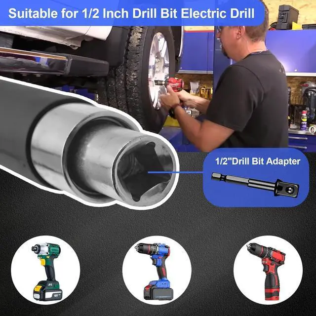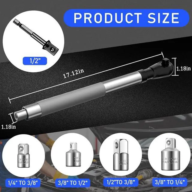 Offset Extension Wrench for Electric Drills and Impact Wrenches, Multi-Function Tool includes 4 Socket Sleeve Adapters and 1/2" 3/8" 1/4" Electric Drill Adapter, Slim for Tight Spaces, Tungsten Steel