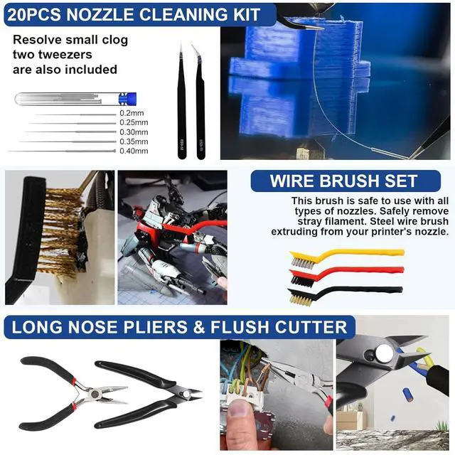 : Includes 3 cleaning brushes, 2 scoops, 2 tweezers of different sizes, and 20 cleaning needles for cleaning needles and debris from your 3D printer's nozzles and other hard-to-reach areas. You can clean the nozzle without disassembling the hotend, saving you a lot of time