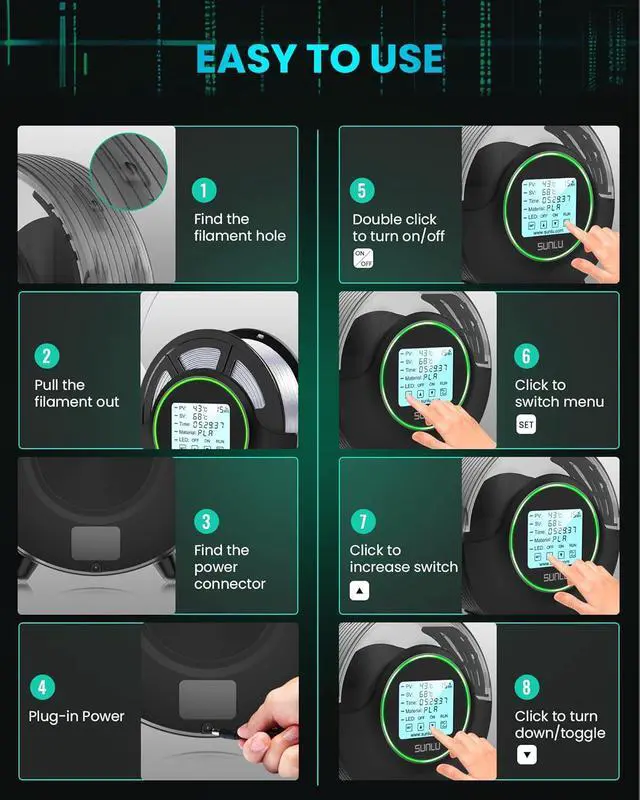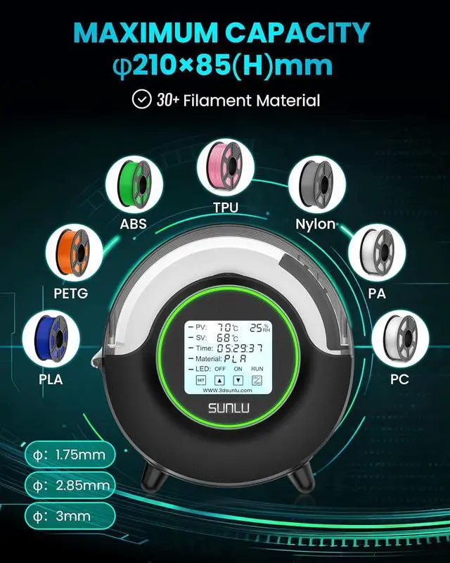 [HIGH COMPATIBILITY & EASY TO USE] Maximum capacity of filament holder is 210*85 (H) mm. Ideal for all 3d printing filaments 1.75 / 2.85 / 3.00 mm PLA PETG ABS TPU Nylon PA PC. Compatible with all major 3D printer filament brands. One click operation, Filament storage box with LED indicator shows real-time working status