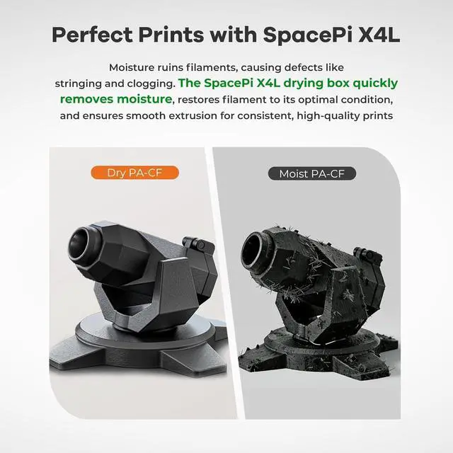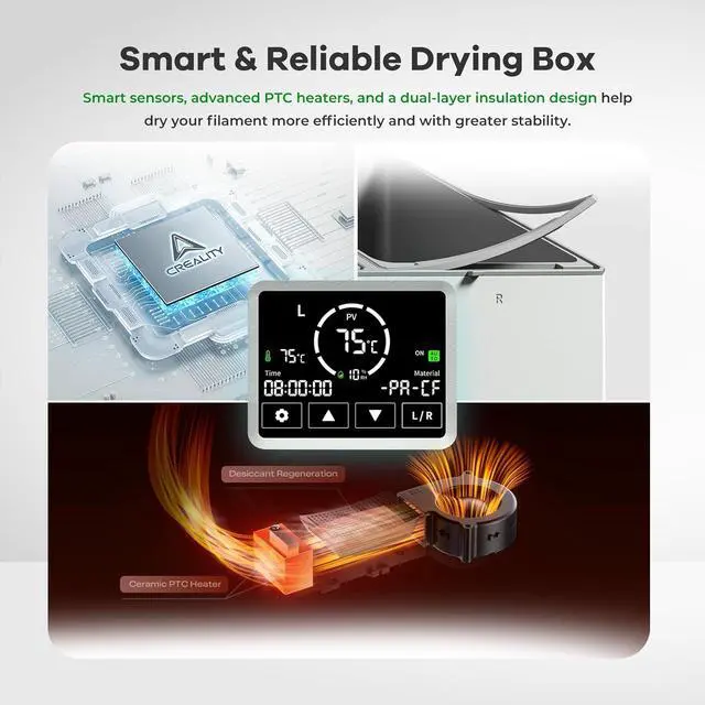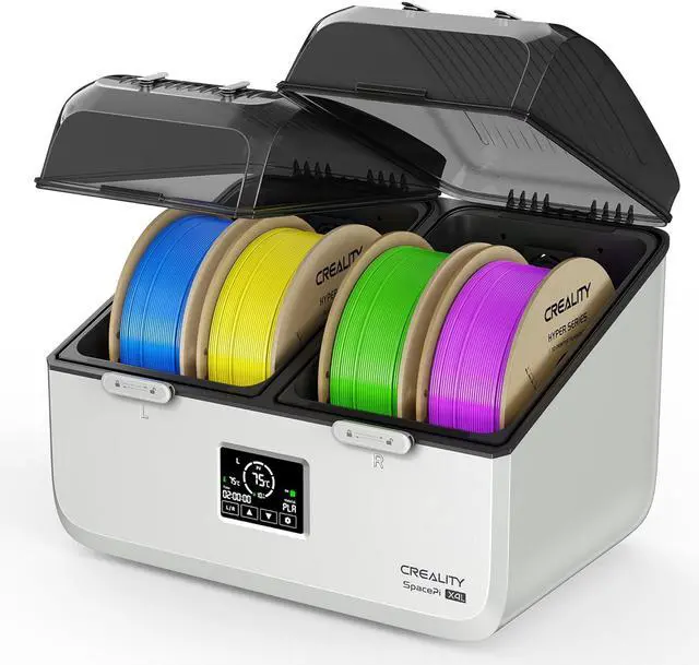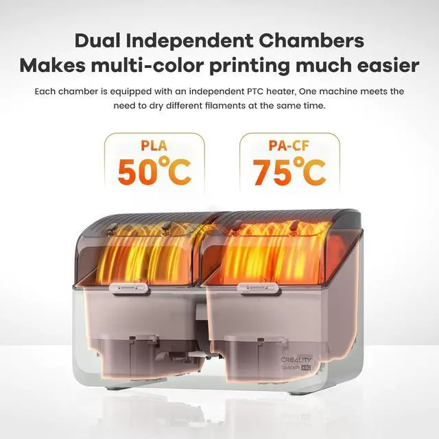 Innovative 4-Spool DesignCreality Space Pi X4L features dual independent chambers that can hold up to four 1kg filament spools simultaneously. Each chamber has its own independent PTC heating system, allowing you to dry different material types at the same time. With multiple output holes, you can dry and print simultaneously to maximize your workflow efficiency.