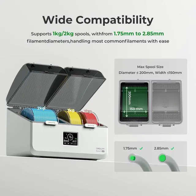 Superior Filament Compatibility The exclusively designed extra-large chambers can each accommodate two 1kg spools or one large 2kg spool. The flexible filament output holes support both 1.75 mm and 2.85 mm diameters, providing maximum versatility for all your 3D printing projects.