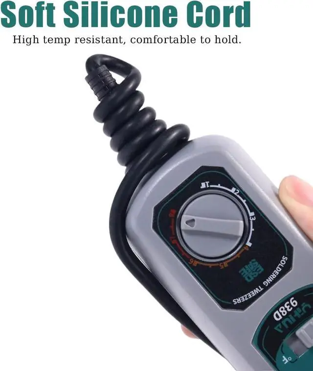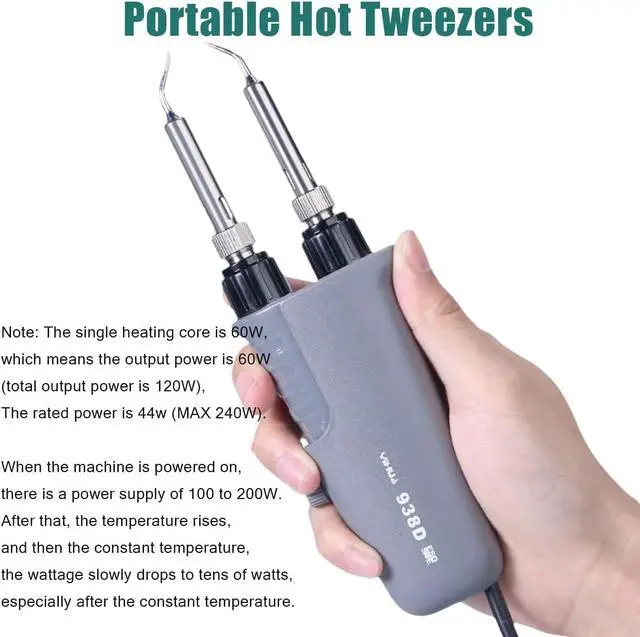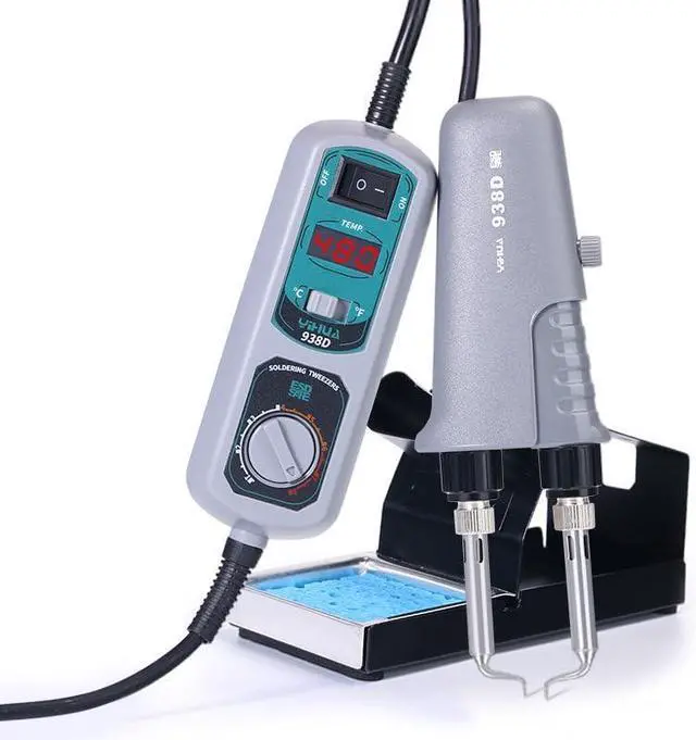 The 938D Mini Soldering Tweezers Station is engineered for professionals and hobbyists who need precise, efficient SMD soldering and desoldering. Featuring dual parallel heated tips, this 60W tool delivers fast and even heating, making it perfect for removing chip components, ICs, and other delicate surface-mount parts. Equipped with a PID temperature control system, it maintains a consistent temperature range of 200°C to 480°C (392°F896°F), ensuring stable operation during long repair sessions. The clear LCD display with switchable °C/°F units allows for easy monitoring, and the auto-sleep function helps conserve energy and protect the heating elements.