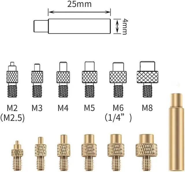 M2-M8 Threaded Inserts Nut compatible: Comes with M2/ 2.5, M3, M4, M5, M6, M8 threaded Inserts heat set insert tip head for the brass knurled threaded insert nuts compatible with a wide range of 3D printed materials and suitable for various applications requiring threaded inserts