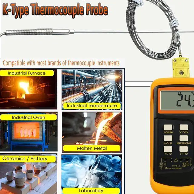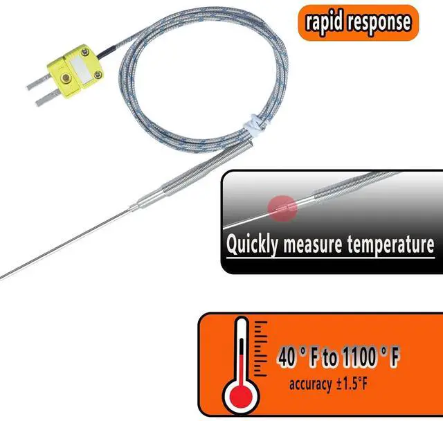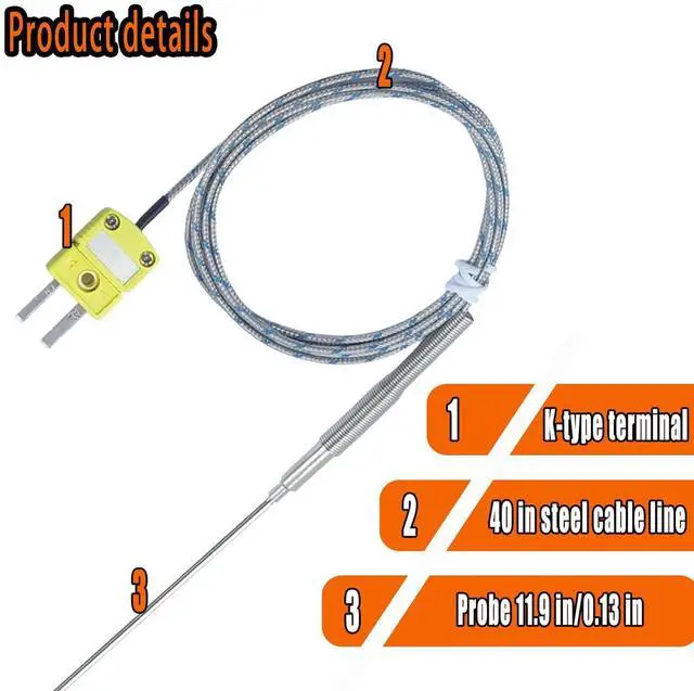 This heavy-duty K-type thermocouple features a 40-inch flexible cable for easy access into tight spaces. The cable is designed for durability and seamlessly connects to most standard K-type meters, data loggers, and controllers for plug-and-play operation