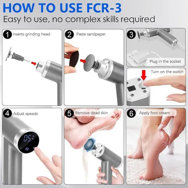TOUCH CONTROL AND DIGITAL DISPLAY: This electric feet callus remover features advanced touch control and a large digital display, allowing you to clearly know at what speed you are using to remove dead skin. Meanwhile, the increase and decrease of the machine's speed, as well as its forward and reverse rotation, can all be controlled by touch.