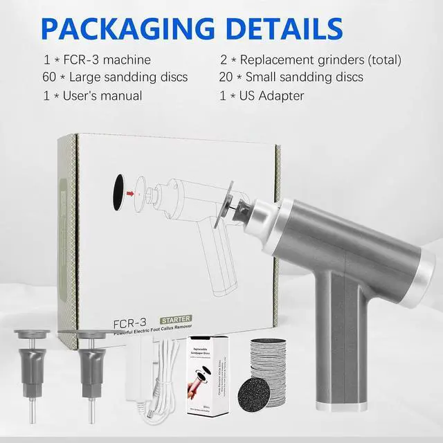 PACKAGING DETAILS: 1*Powerful electric foot callus remover, 1*large grinding head, 1*small grinding head, 60*large sandpapers for the large grinding head, 20*small sandpapers for the small grinding head, 1*user manual, 1*US adapter.