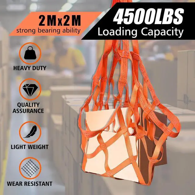 Widely ApplicationGreat for lifting, binding, cargo netting, indoor protection, load-bearing goods in engineering. And the sling hoisting nets are widely used in many fields such as logistics, cargo, construction, aviation, railway, ship, steel, mining, port, machinery and other fields. You can load tie down, pallet lifting, crane use as well