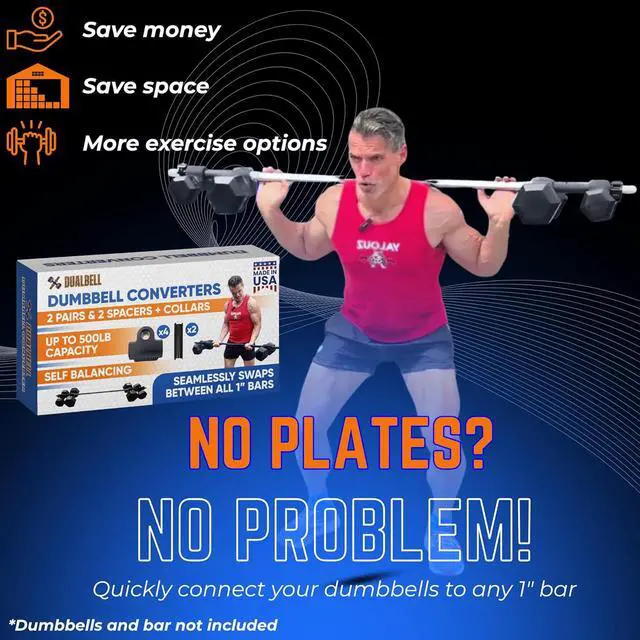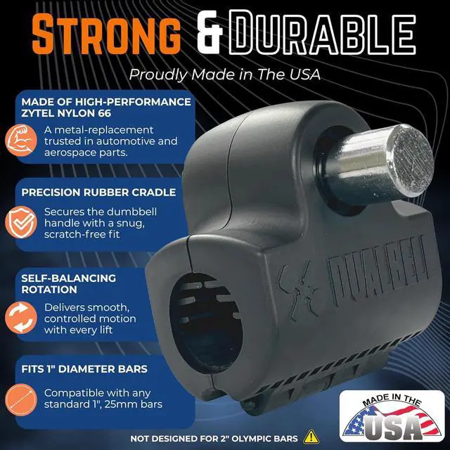 USA-Made Quality - Every dumbbell to barbell converter is proudly manufactured in the USA, ensuring high-quality standards for years of intense workouts. Includes 4 s, 2 weight collars and a storage bag (bar and dumbbells sold separately).