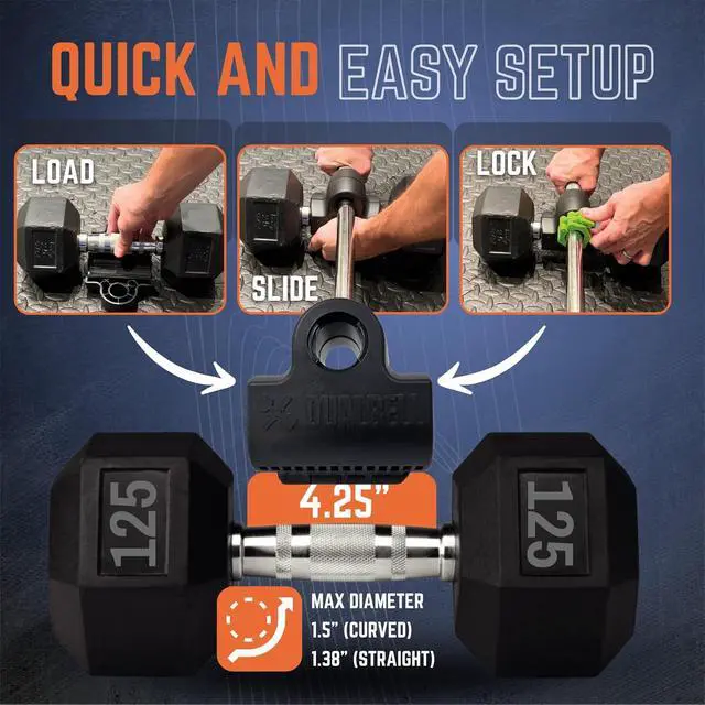 Works with Most Traditional and Adjustable Dumbbells- accommodates dumbbells handles with a minimum length of 4.25" (108mm), and a maximum diameter of 1.38" (35mm) for straight handles, 1.5" (38mm) for curved handles. Rubber insert cradles handle.