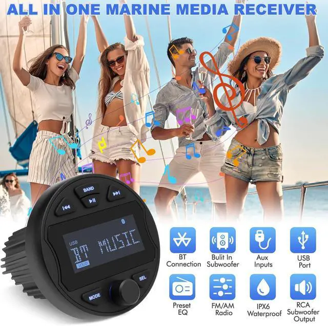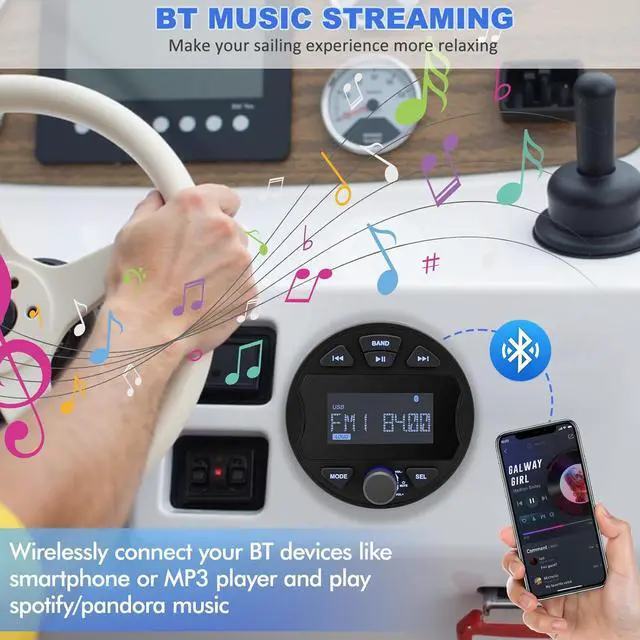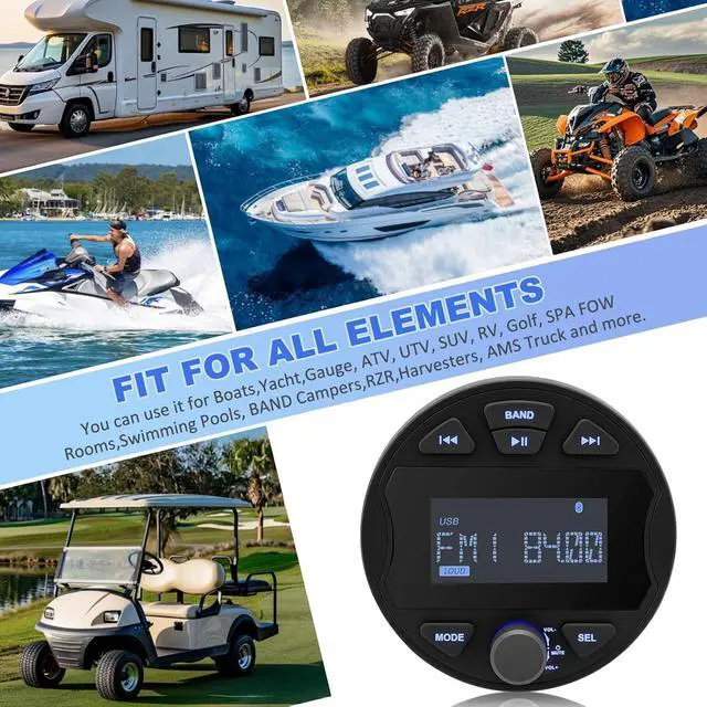WIDE COMPATIBILITY: Our marine radio is not limited to marine use, but also compatible with all-terrain vehicles, golf carts, and more. Providing you with unparalleled convenience in any outdoor setting. Our marine radios for boats is the perfect choice for marine enthusiasts, ATV lovers, golf cart owners, and anyone seeking a reliable, feature-rich multimedia player for their outdoor activities. Upgrade your entertainment system now