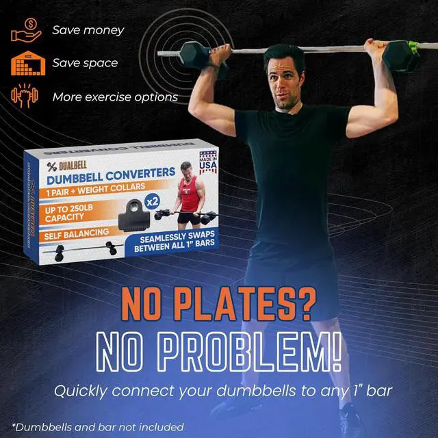 USA-Made Quality - Every dumbbell to barbell converter is proudly crafted and inspected in the USA, ensuring high-quality standards. Includes 2 s, 2 collars, and a storage bag, providing everything you need to enhance your workout (bar and dumbbells not included).