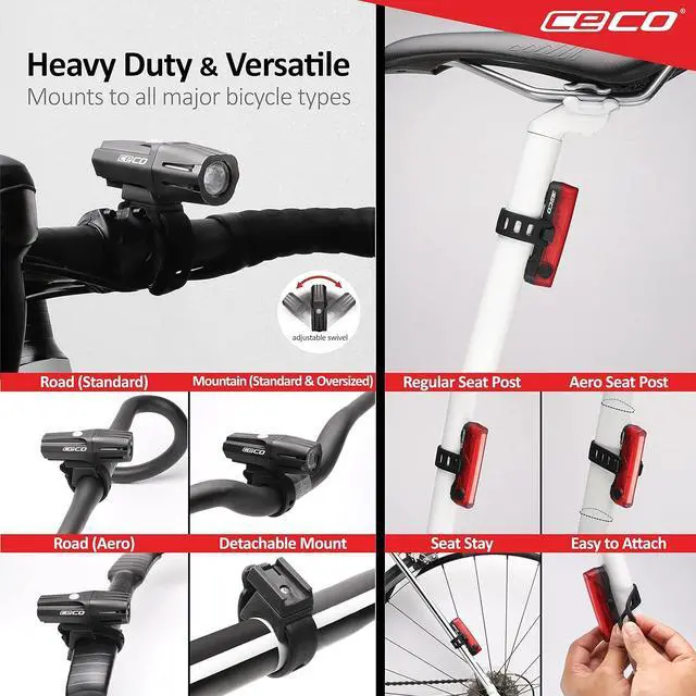 SECURE AND EASY MOUNTING - Heavy duty flexible mounts conform to many types of handlebars & seat posts for fast & easy mounting, including on aerobars & aero seatposts. The headlight swivels left & right to aim the light where it's needed, and the tail light easily mounts & gives an extra wide beam anywhere