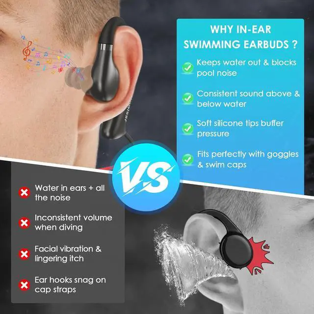 Hi-Fi Sound: Tired of the muddy, vibrating mess typical of bone conduction? We fixed it. Our S36 waterproof headphones for swimming eliminates underwater distortion and uncomfortable face tingling. With 12mm high-precision drivers, you'll get deep, punchy bass and crystal-clear highs. Plus, the included dual hydrolock swim earbuds create a perfect seal to keep water out and the music inno volume jumps, just pure focus!