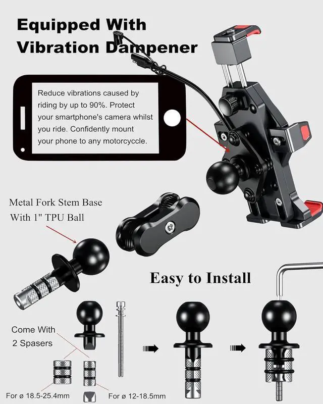Easy To Install: Accessories included with the package allow this cell phone mount easy to attach to motorcycle fork stem. The 1'' ball base designed to fit into the cylindrical or hexagonal bore wall of motorcycle fork stems. The motorcycle fork stem ball base come with 2 metal expansion spacers, small size expansion spacer fit for fork stem tubes 12mm to 18.5 mm in diameter, large size expansion spacer fit for tubes 18.5 mm to 25.4 mm in diameter