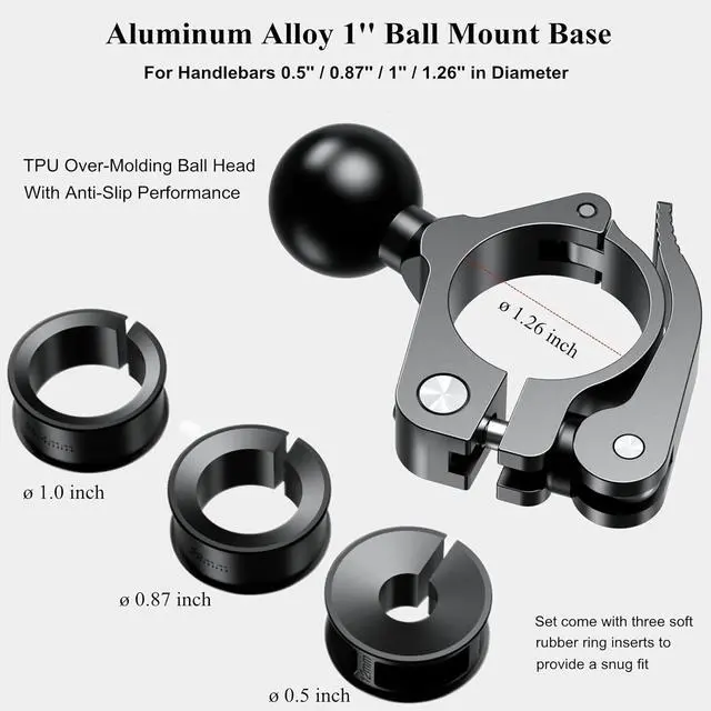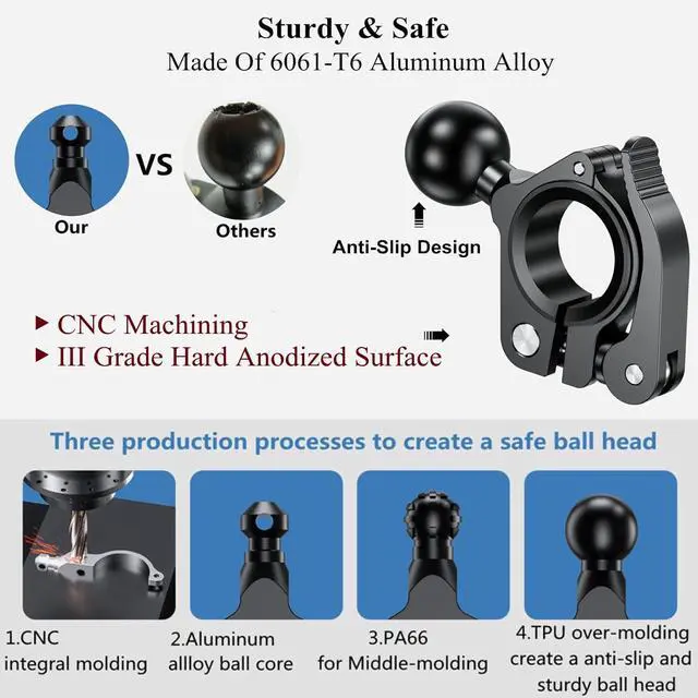 The 1'' ball mount made of 6061-T6 aluminum alloy material with CNC machining and iii grade hard anodized surface for durability and reliability in the most demanding environments. TPU over-molded ball head, anti-slip and wear-resistant