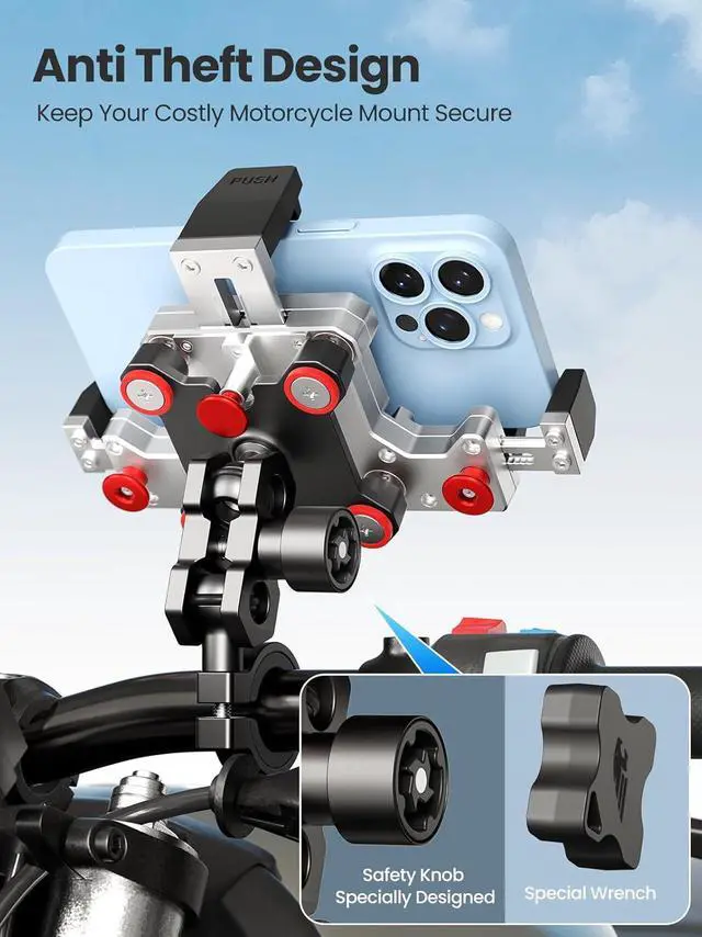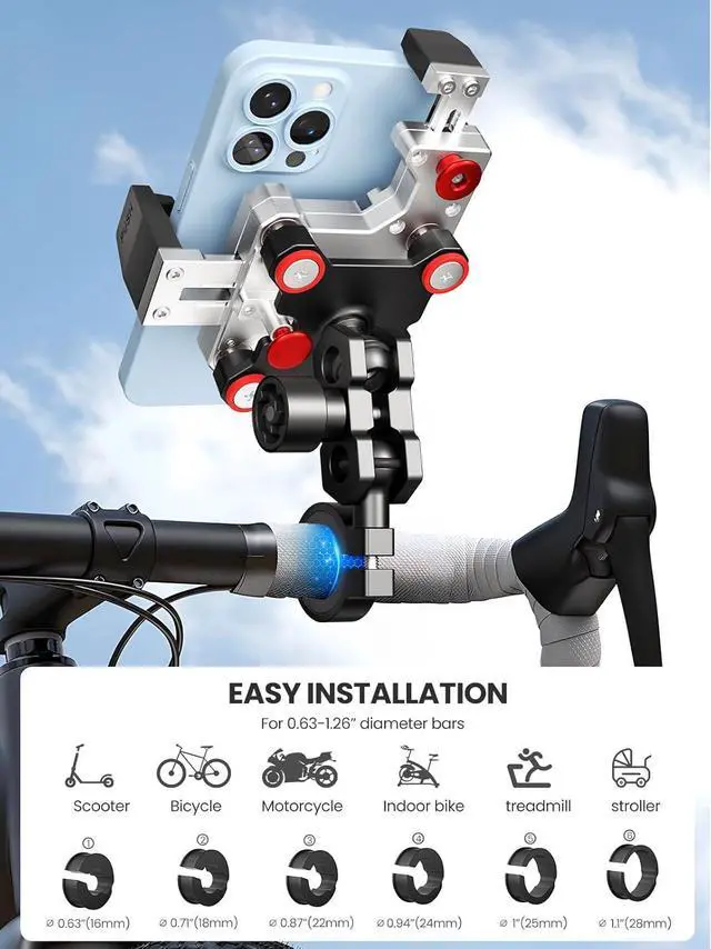 Easy To Install: Accessories included with the package allow this cell phone mount easy to attach to handlebars and rear-view mirror. The motorcycle phone holder handlebar mounting base fit for handlebars 0.63 '' (16mm) / 0.71 '' (18mm) / 0.87 '' (22mm) / 0.94 '' (24mm) / 1'' (25mm) / 1.1" (28mm) in diameter.