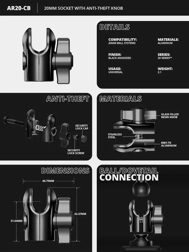 UNIVERSAL PHONE COMPATIBILITY: Our phone holder is designed to seamlessly work with nearly all smartphone models, cases, and sizes. While you're on the go, it ensures a secure fit for any device, whether or not it's in a case. Capable of securely holding devices up to 3.7" wide and 0.6" thick. The CNC billet aluminum phone holder utilizes a 20mm ball connection and is specifically designed for compatibility with our 20 Series Platform, revolving around the 20mm ball and socket system.