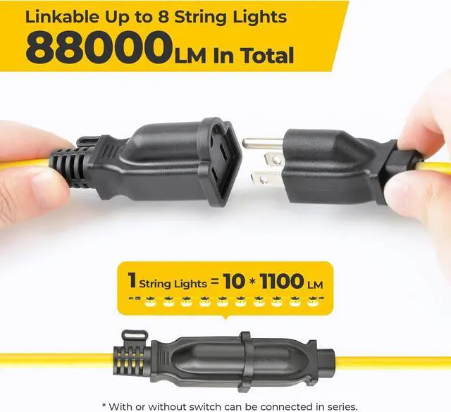 Linkable & Expandable & Protective Plug: The maximum series power is 960W, which means you can connect up to 8 light strings in series. The brightness can reach up to 88000LM. Through the upgraded waterproof plug connection, it can be expanded to the required lighting length according to actual needs to meet various demand scenarios