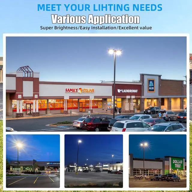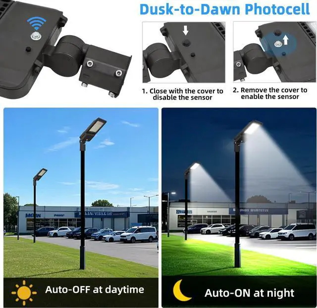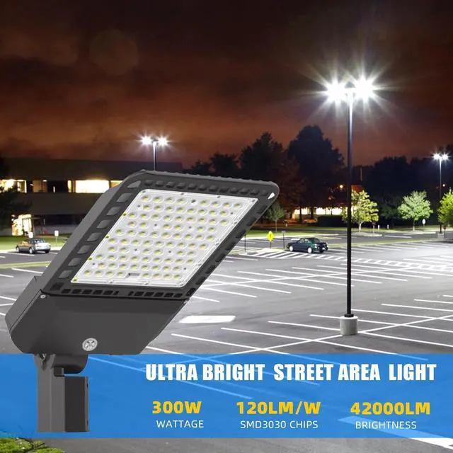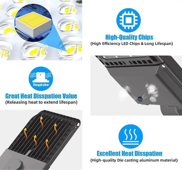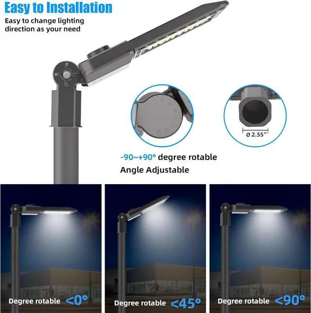 LED Street Light Commercial Grade Material: Led parking lot lights outdoor pole mount are made of die-casting aluminum body and curved lines design, increases the heat dissipation surface and accelerate the air flow. Provide you with 50, 000+ hours of long-lasting lighting service.