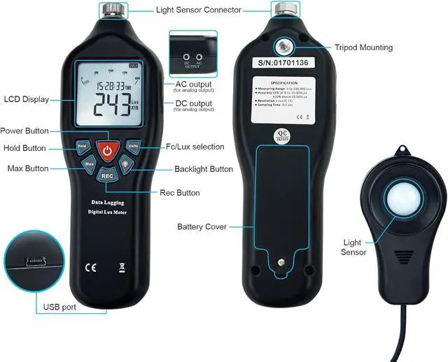Lux Meter + Detachable Light Sensor