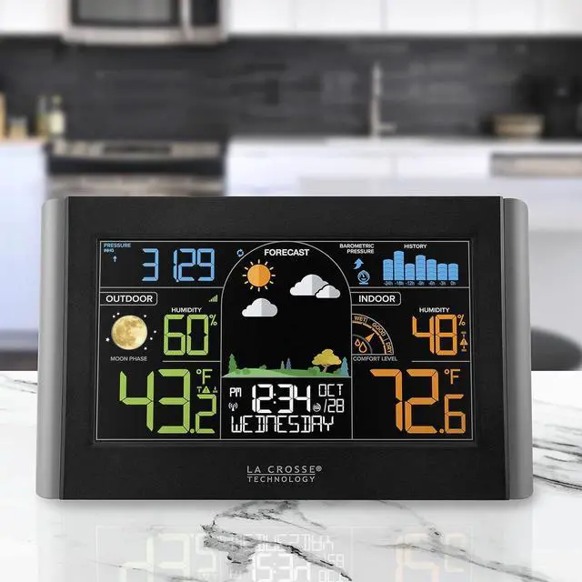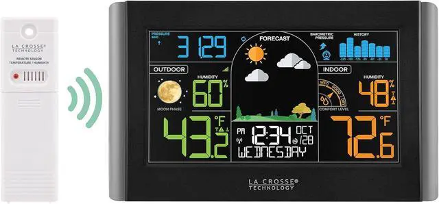 Plan your days with confidence that the weather wont conflict with your activities, and your home and belongings are under desirable conditions with s Wireless Color Weather Station. Keep informed about the day ahead with its accurate local forecast. An attractive and easy to read color display shows future forecast, season changing color foliage, barometric pressure reading with a 24 hour history graph, and indoor/outdoor humidity values. Want to know when the outdoor temperature drops to a certain degree? Or if your indoor humidity is falling? Its custom temperature and humidity alerts help you make sure that your home and backyard temperature and humidity levels are right where they need to be.