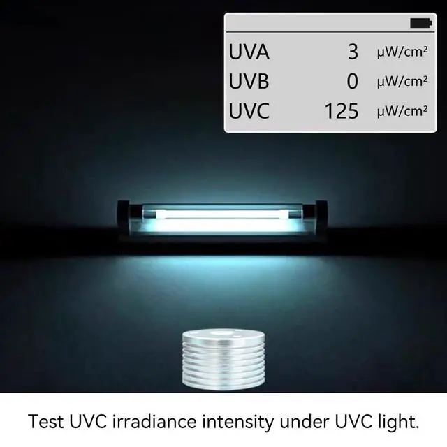 Test the UV index and irradiance intensity of UVC mercury Lamp and 255nm LED lights. Remark: The UVC irradiance testing function is not for sunlight.