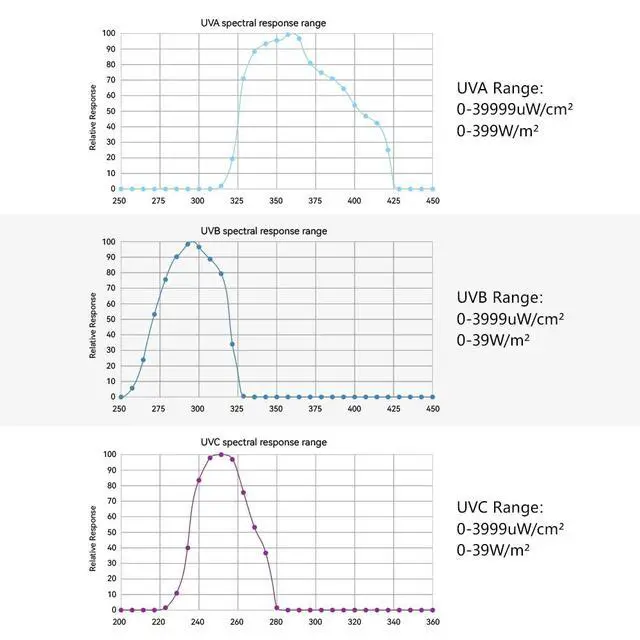 Each sensor is rigorously calibrated under UVB fluorescent, UVC mercury and LED lights. Record the UVI-B, UVI-C, irradiance intensity of UVA and UVC distribution for different points. CE certification. Long time use.