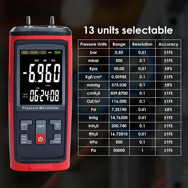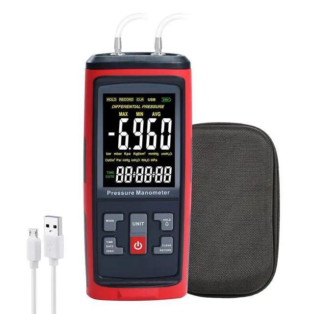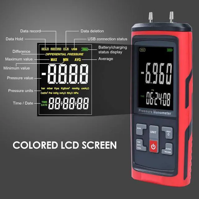 Multi-Functional Manometer is equipped with multi-functional feature like, Data Record, High Low Alarm, Time and Data, Differential Pressure, Data Hold, MAX/MIN/Average, Large LCD with backlight, Low battery Alarm, Auto Power Off Functions