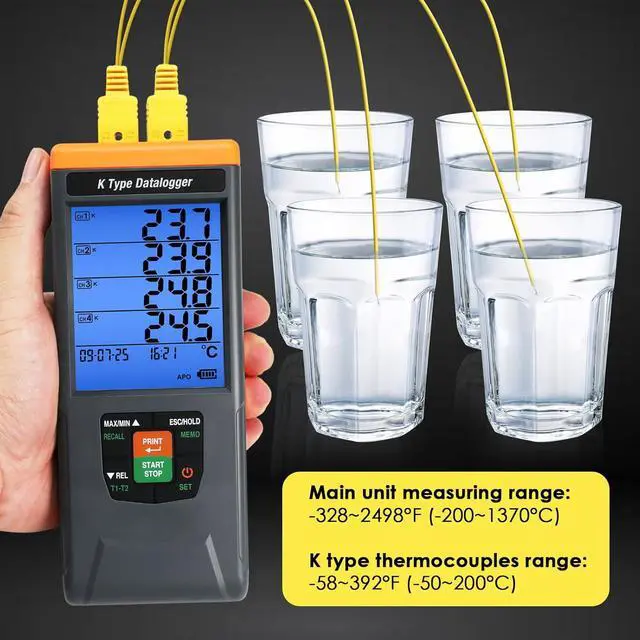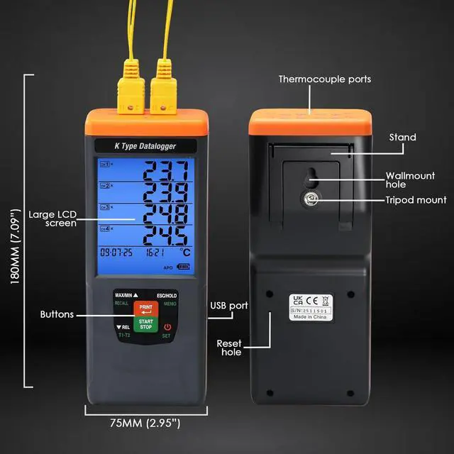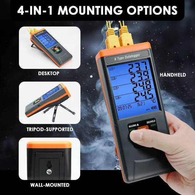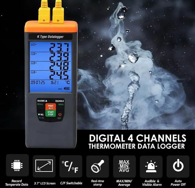 & -Programmable per-channel high/low alarms with buzzer/LED alerts. Offset calibration ±12°C (± 53.6 ), HOLD/REL modes, and dual-color backlit LCD for easy operation.