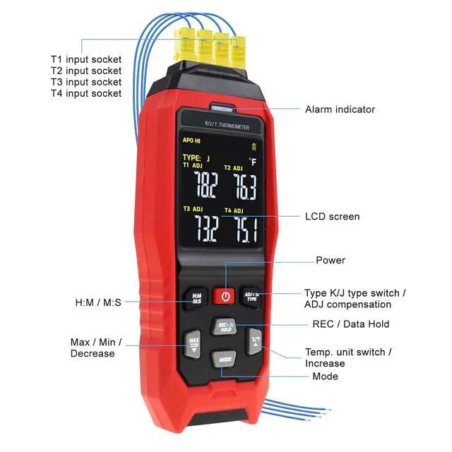 Features data HOLD; MAX/MIN measurement; auto power off and adjustable upper and lower limit alarms; PC software compatible with Win7 Win8 Win10 for data export; chart generation and printing