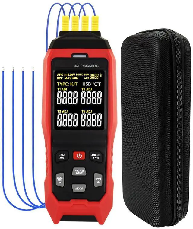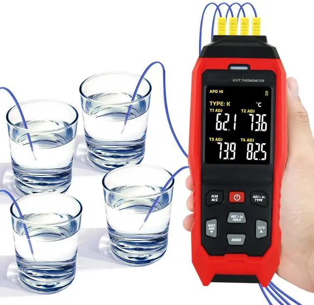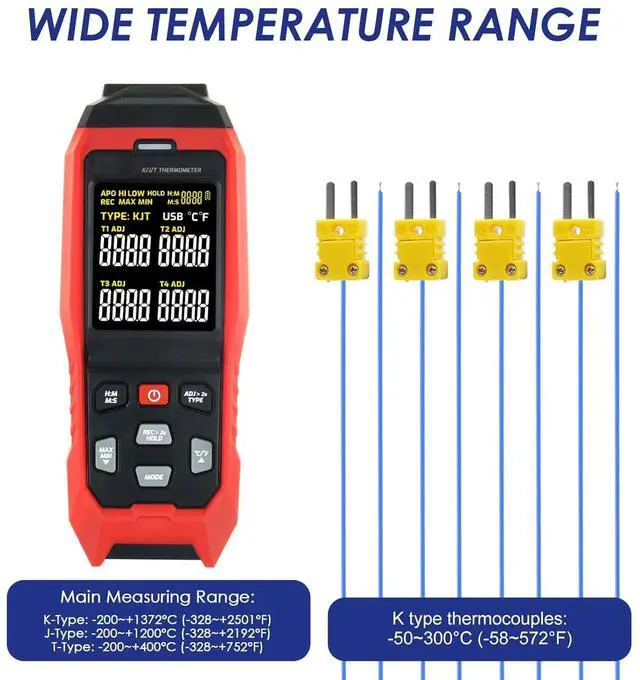 Wide Temperature Measuring Range The main unit of thermometer can measure super wide temperature in rang of -328 to 2501 (-200 to 1372 ) K type, -328 to 2192 °F (-200 to 1200 ) J Type, T Type -328~752°F (-200~400°C). And the 4pcs K-type thermocouples included with the thermometer is from -58~572 °F (-50~300). Greatly meets the user's requirements for superheat or subcooling testing, such as HVAC, microwave oven, aquarium, refrigeration equipment and more