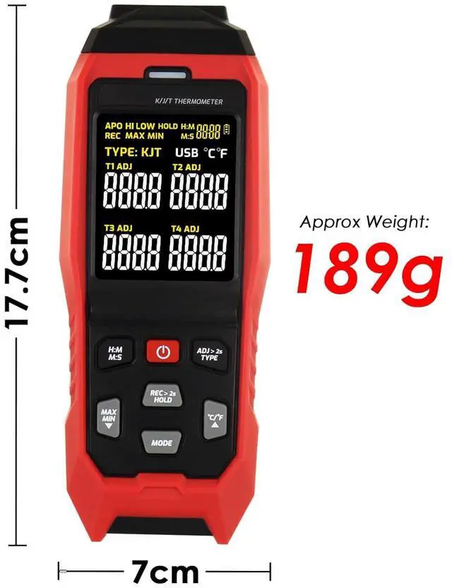 Versatile Thermocouple Meter Features HD Large LCD screen with backlit, °C /°F temp units switchable, multi sampling rates, data hold, Max/Min/Average, audible and visible alarm, auto power off with disable function. Widely used for measuring temperature in liquids and gas, making it a great choice for labs, industries, HVAC and home