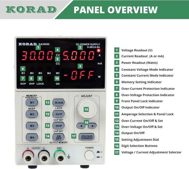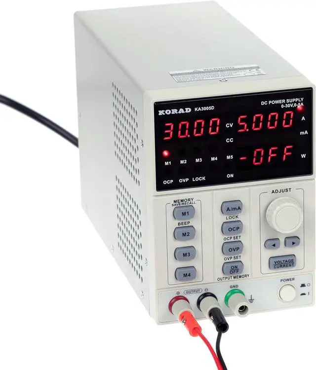 WHAT YOU GET - 1 x KA3005D Power supply, 1 x power cord, 1x Set of 5 Amp test leads, 1 x User manual
