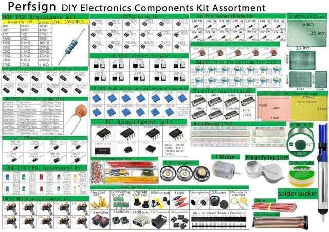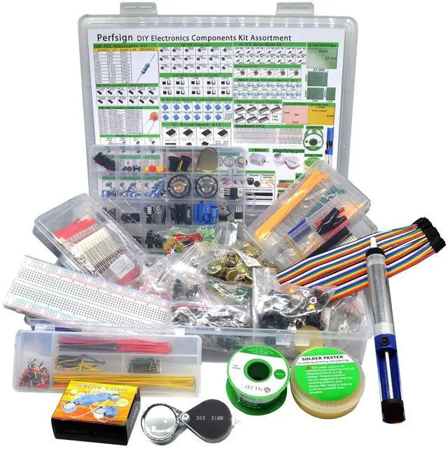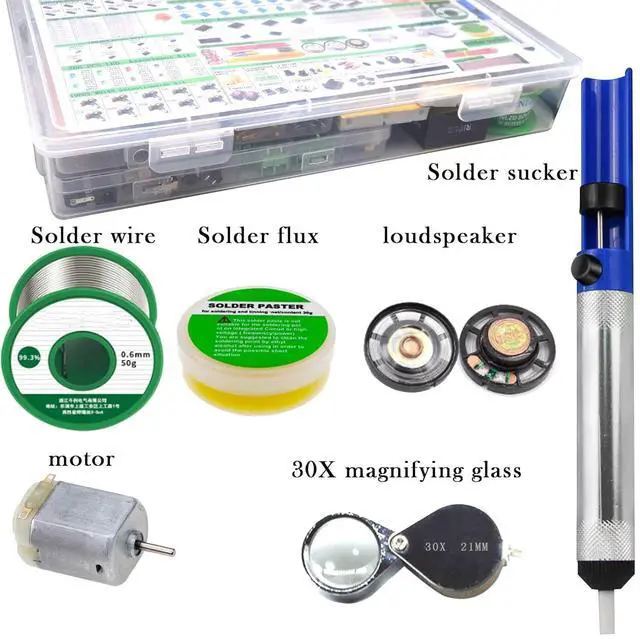 The kit also includes low-temperature lead-free solder, solder flux, a tin absorber for use when removing components, and a 30X magnifying glass for reading component model numbers. Very complete package of electronic components. Suitable for professionals and electronics enthusiasts