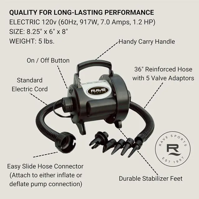 Perfect for a wide range of inflatable needs--from air mattresses to water floatation--this industrial-strength Rave Hi-Speed Pump can inflate a 15-foot Aqua Jump water trampoline in just seven minutes. Lightweight, compact, and rugged, the Rave delivers high-volume air power ( 2.5 PSI inflation pressure) and it includes four standard inflation adapters to fit most small inflatables. The unit also features a 36-inch long reinforced tube and built-in overheat protection. It measures 8.25 x 6 x 8 inches (LxWxH).
