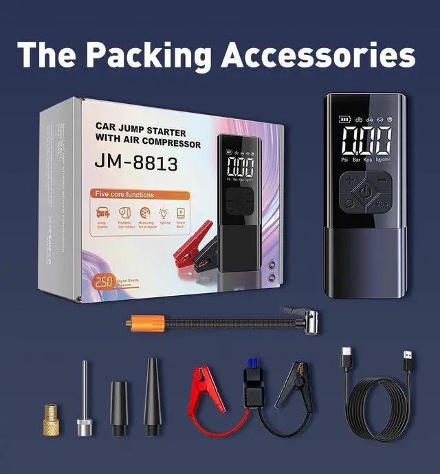 Experience the convenience and reliability of the portable air pump for car tires, tire inflator portable air compressor, and jump starter with air compressor your trusted partner for all your vehicle and tire needs.