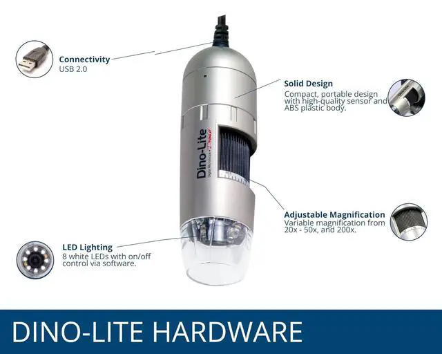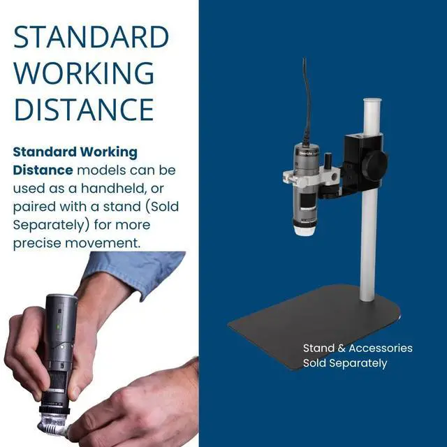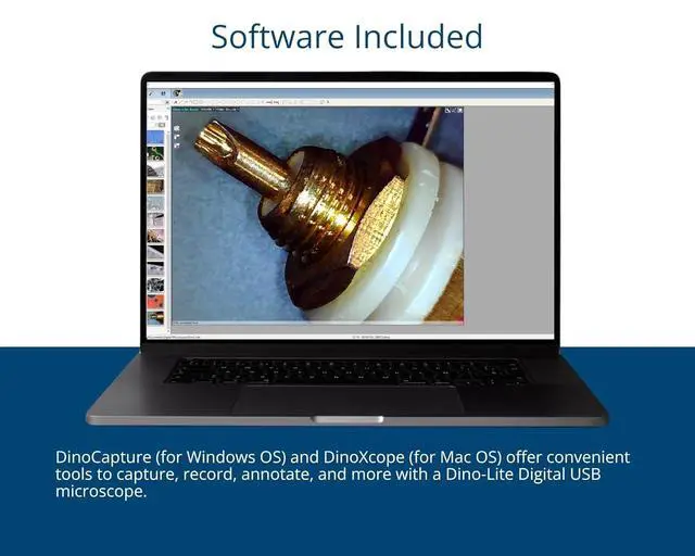 Standard working distance Provides a balanced field of view for typical inspection and viewing needs. Software included (Windows + Mac) DinoCapture and DinoXcope offer powerful tools for capturing, annotating, images&videos on both Windows and Mac.