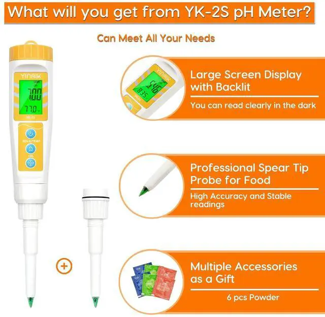 Digital pH Meter for Meat: With the unique Spear Probe the pH meter can easily test the pH of the meat. digital pH Tester is small and compact; convenient for easy on-site testing. Just cut a piece of meat and stick the spear tip into the sample, waiting for the reading to be stable, then you can get the accurate measurement.