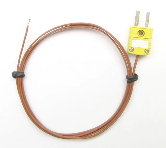 This is a set of 5 reliable wire K-type thermocouple with a Type K temperature sensor. The beaded sensor is at the tip of a 3ft long wire probe, which has a high temperature PFA plastic insulation. This Teflon PFA based high temperature insulation makes the K-type thermocouple easier to clean than fiber glass insulation. It has a miniature k-type connector that will work with digital K-type thermometers. This k-type thermocouple probe can used to measure air or gas temperatures, it can be attached to pipes or embedded into objects you want to measure.