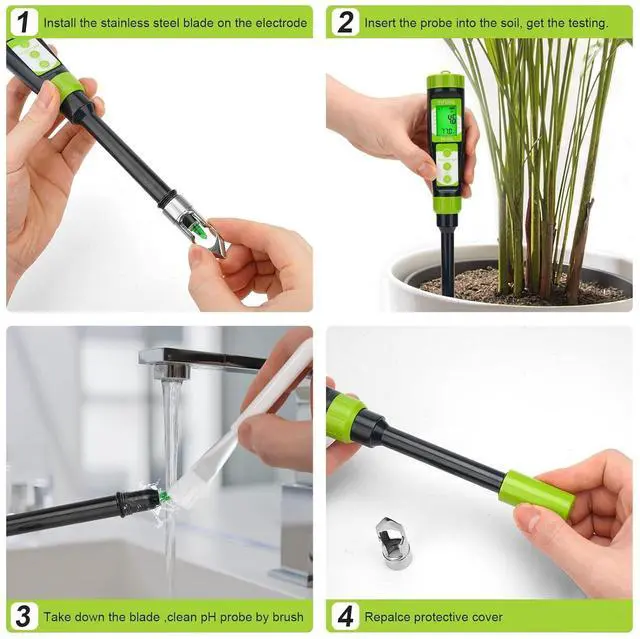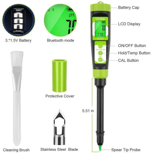 {Powerful Digital Soil pH Tester for Avid Gardeners} Soil pH Tester is equipped with a new sensitive spear tip electrode which can obtain the pH value of the soil quickly and accurately. A tapered stainless-steel dibber that can be firmly attached to the pH pen, ensuring your tester could measure all types of soil without worrying about damage to the electrode. even provides an extra electrode for free to buyers to ensure that our fans can use the tester for a long time
