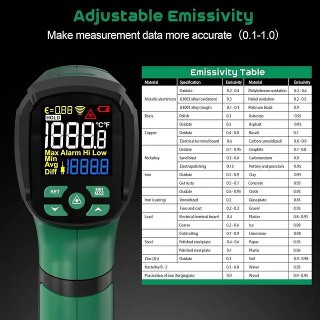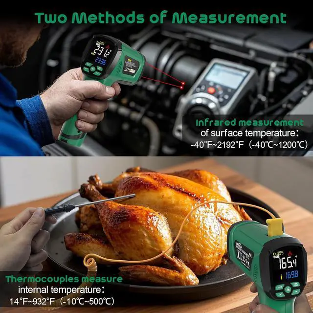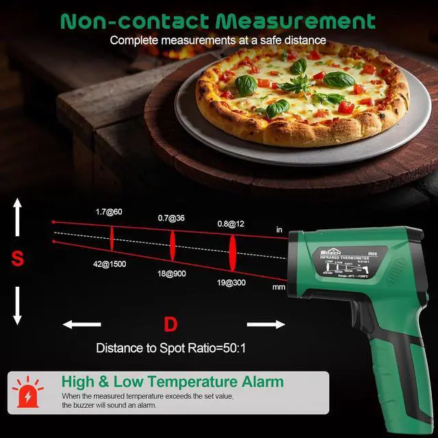 Non-contact MeasurementThe high temp thermometer has a 50:1 object-to-distance ratio, so you can measure hot, toxic or hard-to-reach objects from a safe distance, and the thermometer gun will provide the measurement value within 0.5 seconds. If you don't want to use the laser, you can also turn it off with the button on the laser thermometer gun.